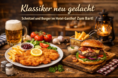 Im Hotel-Gasthof Zum Bartl treffen zwei Klassiker aufeinander: knusprige Schnitzel und saftige Burger, frisch zubereitet und mit regionalen Zutaten verfeinert. Bodenständige Wirtshausküche verbindet sich hier mit modernem Genuss in gemütlicher Atmosphäre.